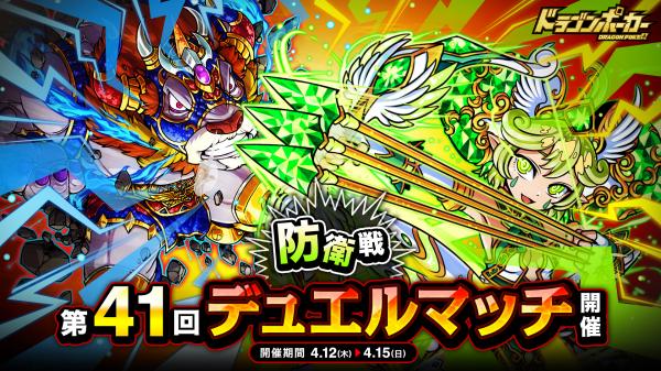 4月12日(木)より、1vs1のリアルタイム対人バトル「第41回デュエルマッチ本戦」を開催いたします。今回のルールは「防衛戦」です。デュエルマッチでは、バトルで獲得できる「デュエルP」に応じてランキングが決まり、リーグ終了時に報酬が獲得できます。また、累計勝利数に応じて、限定カードも手に入ります。相手の心理を読み、1vs1の真剣勝負に挑みましょう!