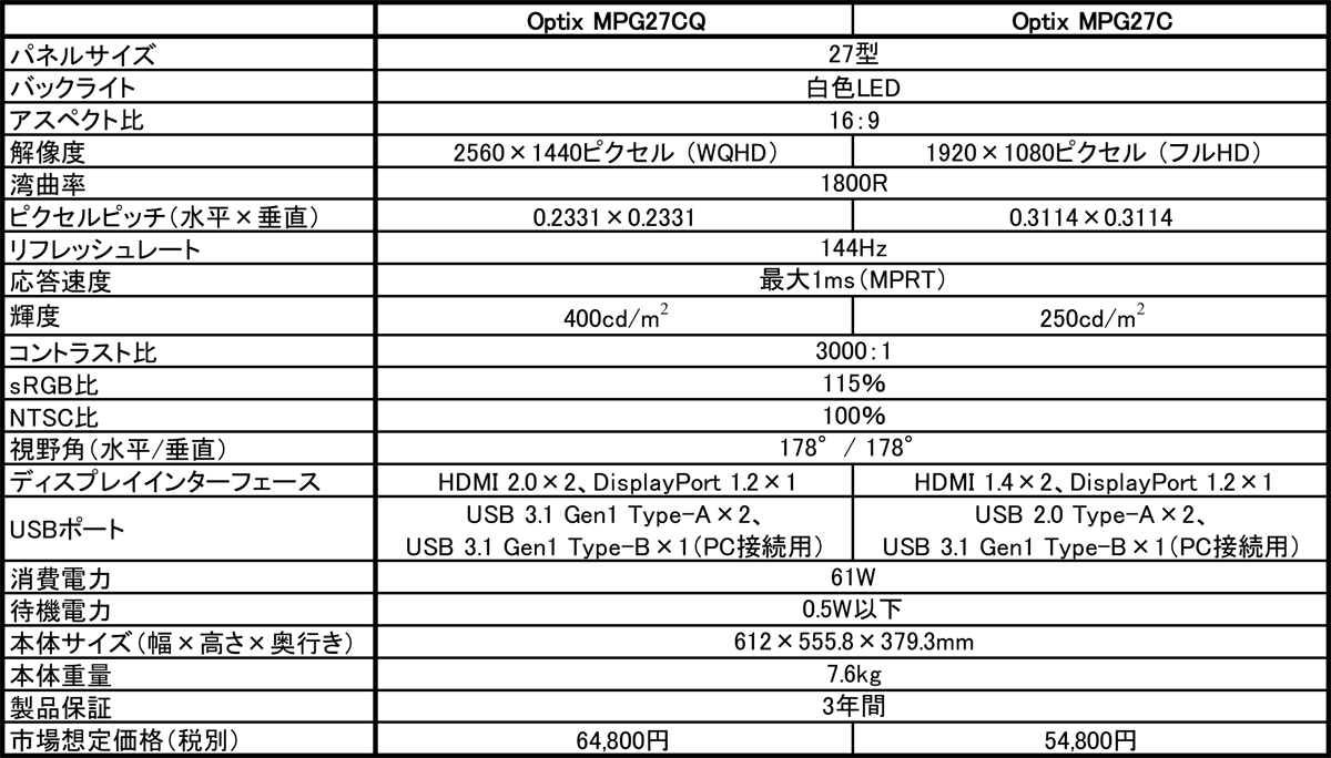 下位モデルとなるOptix MPG27Cは、解像度が1920×1080ピクセル表示のVAパネルを採用し、コントラスト比は3000:1、最大輝度250cd/平方mで、sRGB比115%、NTSC比100%のTrueColor表示に対応。HDMIは1.4、USBポートは2.0となりますが、そのほかの基本仕様は上位モデルのOptix MPG27CQと同等です。