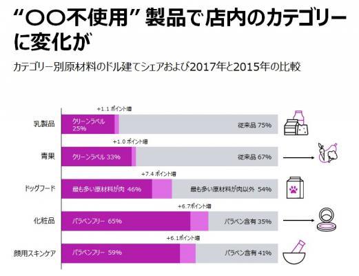 製品の原材料について、米国の消費者の68%が食品に何が「含まれていないか」に関心があると答えています。人工着色料など好ましくない添加物や特定の原材料を「不使用」とした製品によって、小売店内での乳製品、青果、ドッグフード、さらにさまざまな非食品における分類とカテゴリの枠組みに変化が起きています。