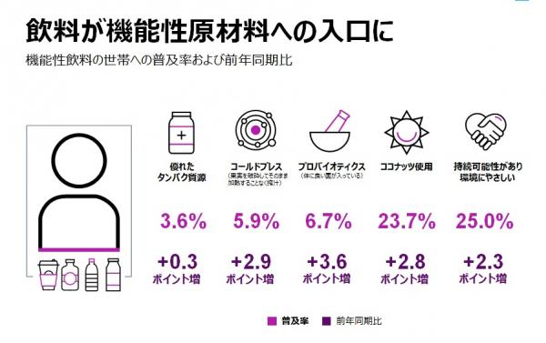 消費者は特定の原材料に含まれるとされる健康効果を期待して、“薬”のような食品をますます求めています。飲料は、機能性食品への入口として優れたカテゴリの一例です。「良質なタンパク源」、「コールドプレス(冷間搾汁)」、「プロバイオティクス(善玉菌)」などの機能性原材料は、飲料カテゴリーの顕著な伸びの原動力となっています。