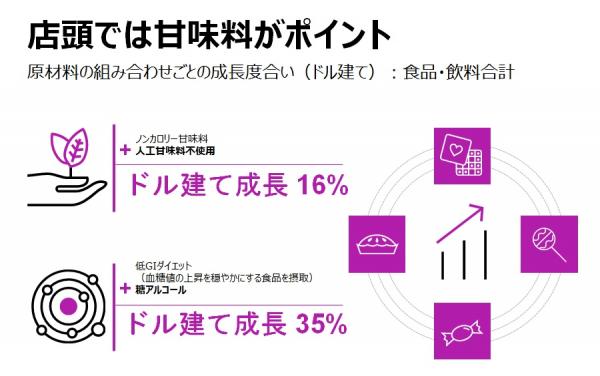 摂取量について消費者がつねに細心の注意を払っている原材料が1つあります。それは糖類です。Label Insightが実施した調査によると、全米で22%の米国人が糖類の摂取量を制限することで自ら問題に対処していると答え、2人に1人が今年は糖類を控えたり、“無糖”の製品を購入したりする意向を示しています。店頭では、製品に使用された甘味料がポイントです。特に、ノンカロリー甘味料を使用した製品や人工甘味料不使用の製品の売上は、昨年はドル建てで16%成長しました。