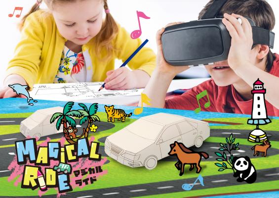 「マジカルライド」は一眼タイプのVRヘッドマウントとスマートフォンを利用し、乗り物の塗り絵に色塗りをして、それをスマートフォンで覗くと、3Dで色塗りをした乗り物が現実世界に出現し、その乗り物を専用コントローラーで動かすことが出来るこども向けのデジタルペーパークラフトです。