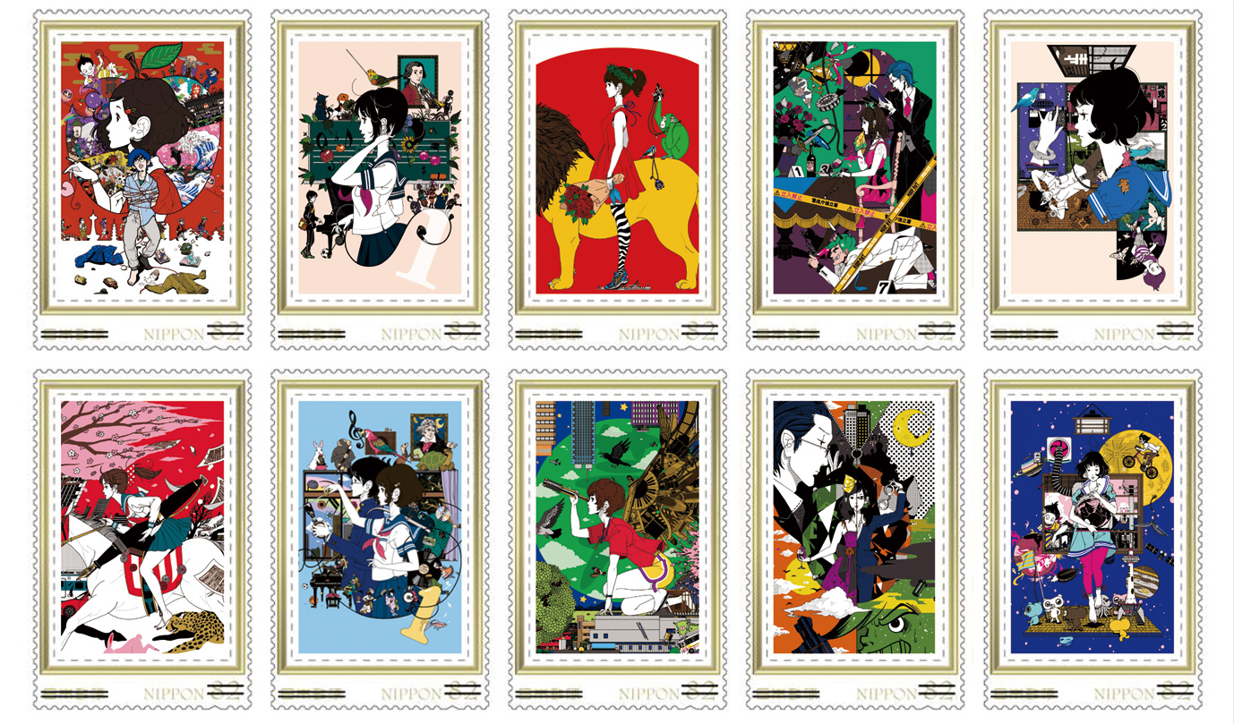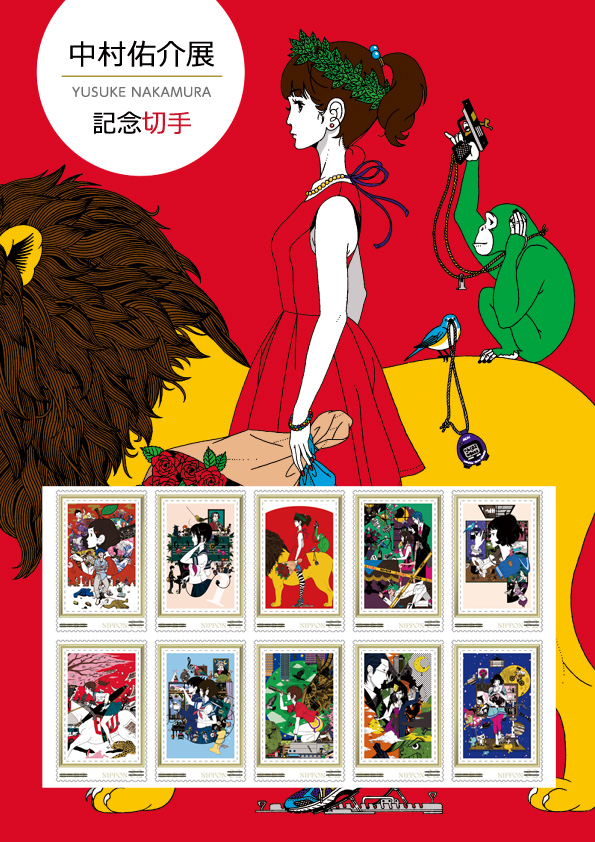 本展覧会の開催を記念して、『e-DIVE』では「四畳半神話体系」や「夜は短し歩けよ乙女」、「謎解きはディナーのあとで」など、中村佑介の手がけた人気イラスト10点が収録された中村佑介展記念フレーム切手セットを企画しました。