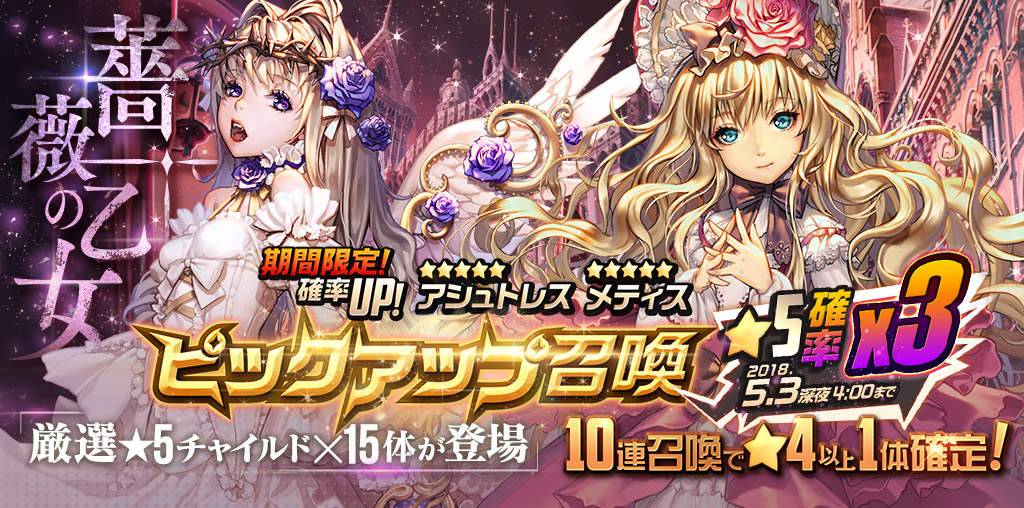 鉄壁の防御を誇るスキル効果「忍耐」を貫通する新スキル効果「直撃」を持つ新追加チャイルド攻撃型★5「アシュトレス」(CV:堀江由衣)と、不死効果を付与することが出来る回復型★5「メティス」(CV:田村ゆかり)がピックアップ召喚15体の中でもさらに召喚確率UPで登場!!