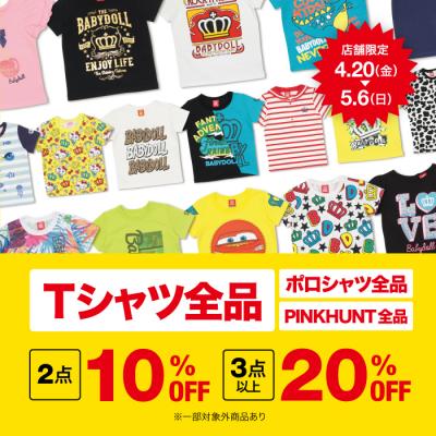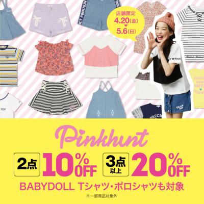株式会社コージィコーポレーションが運営するベビー・キッズ服ブランドBABYDOLL(ベビードール)とジュニアガールズブランドPINKHUNT(ピンクハント)がBABYDOLL(ベビードール)・STARVATIONS(スターベイションズ)・PINKHUNT(ピンクハント)、通販各店てに、実店舗限定!!<Tシャツ・ポロシャツ★PINKHUNT商品★どれでも2点10%OFF・3点以上20%OFF>を開催します。