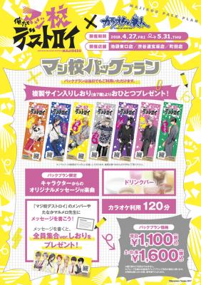 本企画では、おげれつたなか先生 あらため たなかマルメロ先生が描くアイドル青春サクセスストーリー『俺たちマジ校デストロイ』コミックス第2巻(5月1日(火)発売)の発売およびデビュー楽曲のカラオケ配信開始を記念して、期間限定コラボパックプラン「マジ校パックプラン」を提供。当パックをお選びいただいた方に、複製サイン入りしおり(全7種)をおひとつプレゼントするほか、パックプラン限定のキャラクターからのオリジナルメッセージ付き楽曲を配信いたします。