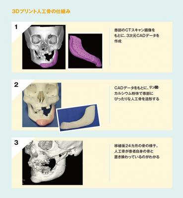 今回、(株)ネクスト21が開発したカスタムメイド人工骨は、世界で初の3Dプリンターを用いて成形しています。その材質は、カルシウム欠損型HAであり、最適な再結晶化のために新規硬化処理方法を採用しております。3Dプリンターでは、骨内部構造を形成し、0.1mmの精度での形状を再現することが出来ます。 そのため、3Dプリンターによる製造方法は、人工骨のような生体材料の成形に最も適しております。