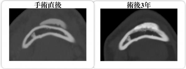 欧米ではボーンバンクからの他家骨移植が主体ですが、日本では自家骨移植が中心であり、患者自身の足の骨や腰の骨を外科的に摘出し移植するため、自骨と癒合しやすい長所がありますが、摘出の際に患者へ新たな骨欠損が生じます。
