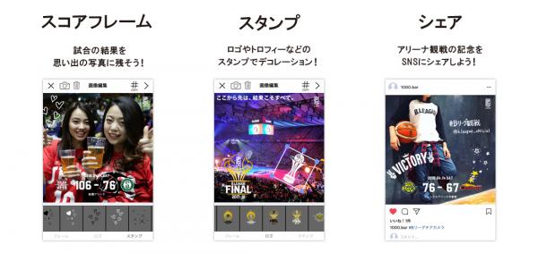 チアカメラは、B.LEAGUEの試合データを、アリーナ観戦の記念写真などに重ねてSNSにシェアできる機能です。また、ボールやトロフィーなどのオシャレなスタンプを追加して、投稿を楽しくカスタマイズすることも可能です。