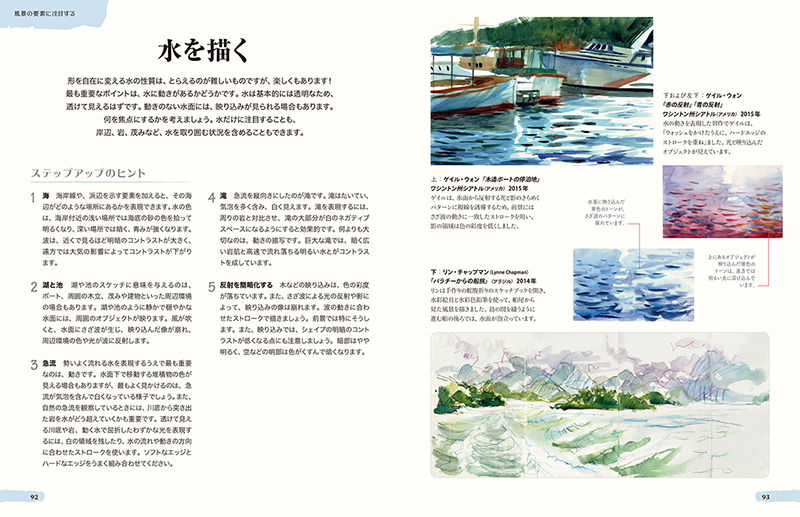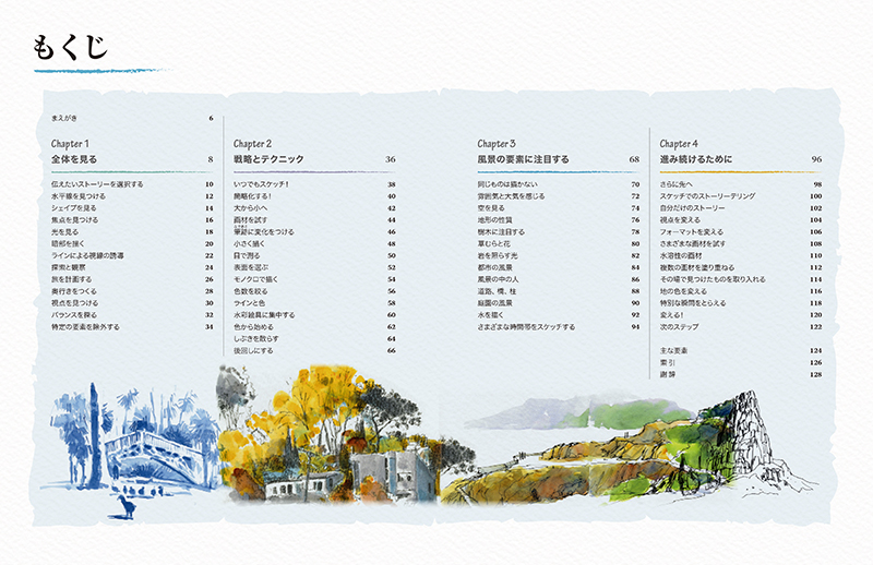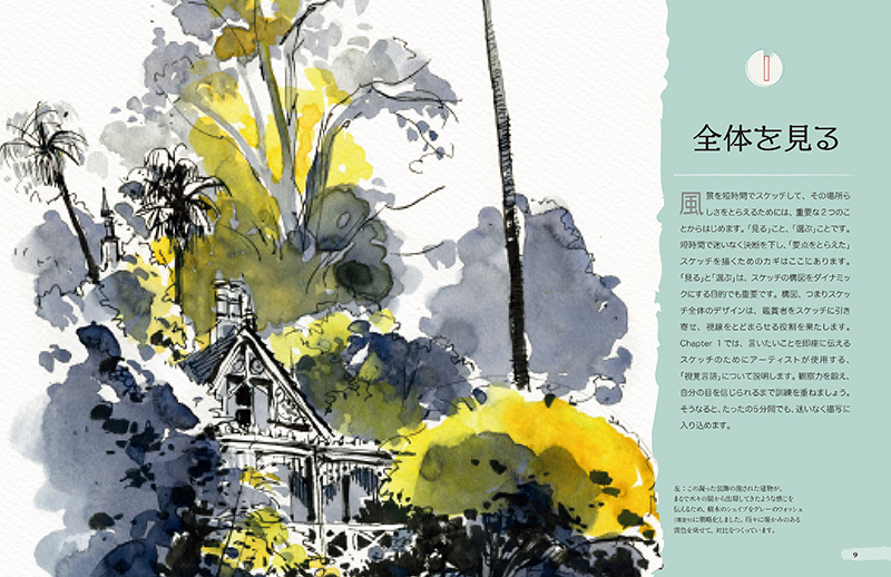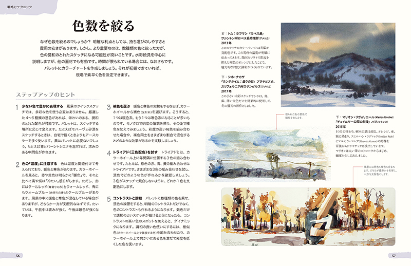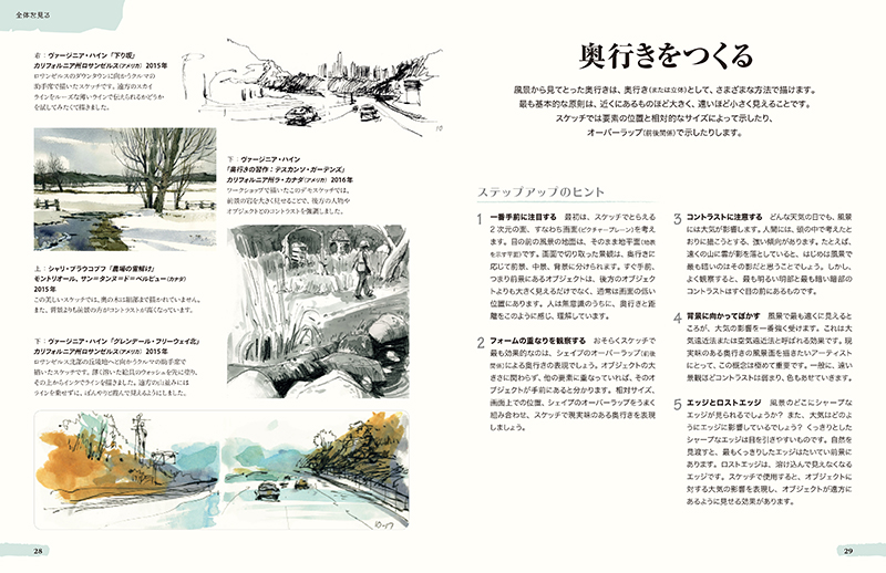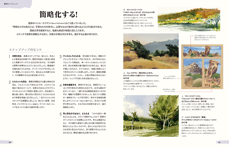 気軽にスケッチを楽しみたい人にも、大作の習作や、アイデアをまとめるためにスケッチを描きたい人にも役立つティップスと作例が、見開き2ページごとにまとまっています。