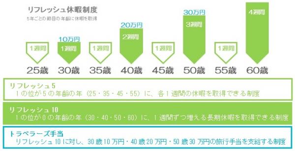 当社は、30歳1週間・40歳2週間・50歳3週間・60歳4週間の長期休暇を取得できる独自の制度『リフレッシュ10』を2010年4月から、25歳・35歳・45歳・55歳にそれぞれ1週間の休暇を取得できる『リフレッシュ5』を2014年4月から開始しました。2017年1月からは、より有意義に『リフレッシュ10』を過ごしてもらえるよう、30歳10万円・40歳20万円・50歳30万円の『トラベラーズ手当』を支給しています。いずれも、取得率は100%です。(出向者除く)