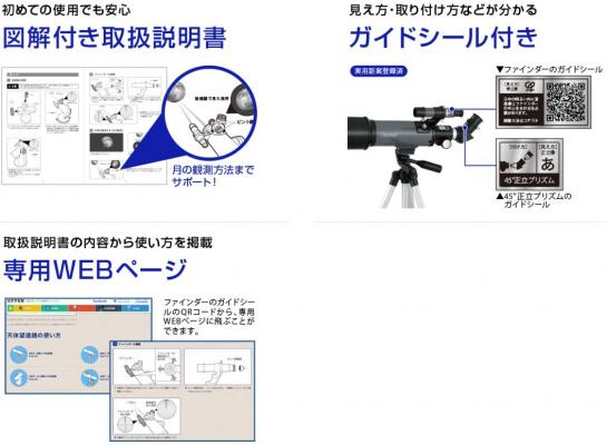 今回発売する天体望遠鏡4機種は、“丁寧なサポート”が特徴で「(1)図解付き取り扱い説明書」「(2)ガイドシール」「(3)専用WEBページ」の3つのサポートがついており、初めての方でも分かりやすく扱うことができます。
