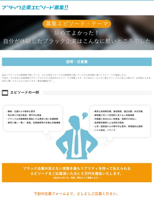 そのため、当社は、リアリティを持ってブラックな労働環境の問題を伝えたいと考え、ブラック企業の実態がわかる実際のエピソードを募集することに致しました。
