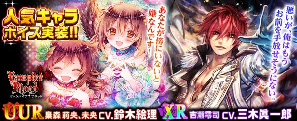 ソーシャルゲーム開発を行う、株式会社テンダ(本社/東京都豊島区、 代表取締役社長/小林 謙)は、「mobage(モバゲー)」など各ゲームプラットフォームで提供中のソーシャルゲーム『ヴァンパイア†ブラッド』にて4月30日(月)より「<UUR>梟森莉央(CV. 鈴木絵理)」「<UUR>梟森未央(CV. 鈴木絵理)」「<XR>吉瀬零司(CV.三木眞一郎)」のボイス付カードを追加したことをお知らせいたします。