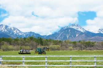 「ヘイ」とは干し草のこと。干し草を積んだトラクターの荷台に乗り、牧草地をのんびりと1周します。晴れた日には澄み渡る青い空と雪帽子をかぶった八ヶ岳、富士山を背景に、新緑の草原を周遊する爽快感はたまりません。