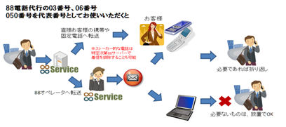 (1) 営業電話はもちろん、いたずら電話、または拒否したい電話などを88電話代行のサーバーが電話を自動で振分けますので、電話番号が特定できればビジネスに必要な電話のみをお客様に転送したり、特定できない場合は88電話代行で電話をお受けし、ビジネスに必要なものだけをメールでお伝えいたします。