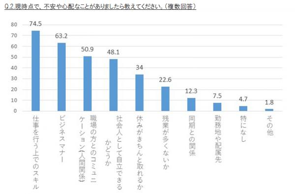現時点で不安なこと・心配なことを聞いたところ、TOP3は「仕事を行う上でのスキル(74.5%)」「ビジネスマナー(63.2%)」「職場の方とのコミュニケーション(50.9%)」という結果となりました。
