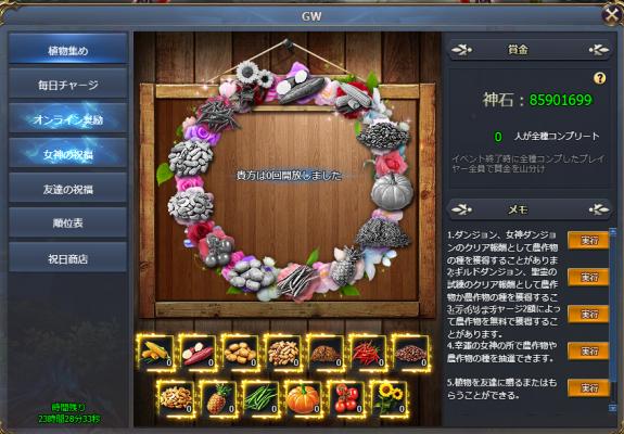 イベント期間中、ダンジョンや女神の祝福から獲得できる種を集めると、植物に交換することができます。13種類の植物を全て集めて納品すると、神石が獲得できます。
