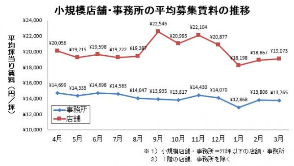 小規模店舗(20坪以下)の平均募集賃料は、前月から1.1%上昇しました。