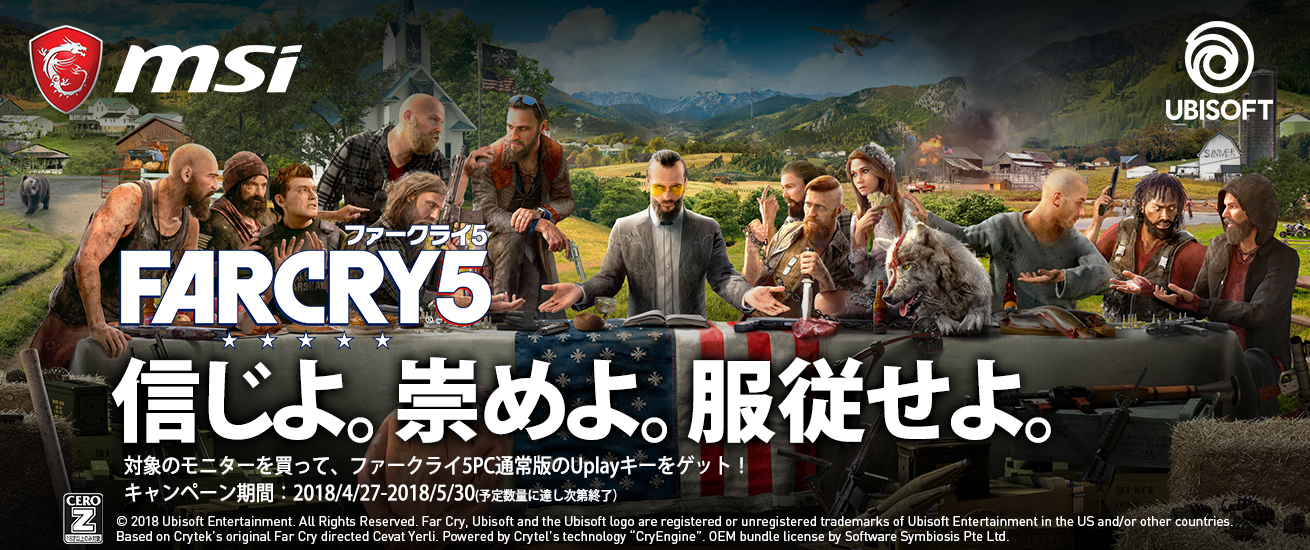 2018年4月27日 - Micro-Star International Co., Ltd. 台湾・新北市 - GAMING向けハードウェアの設計で世界をリードするMicro-Star International(MSI)は、湾曲型GAMINGモニターの「Optix MAG27CQ」、「Optix MAG27C」または「Optix MAG24C」をご購入された方を対象に、本日4月27日から5月30日までの期間中、人気オープンワールドアクションゲームFar Cryシリーズの最新版「Far Cry 5」のPC通常版Uplayキーをプレゼントするキャンペーンを実施いたします。