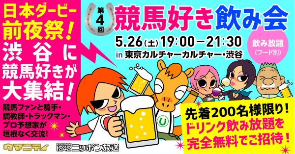 競馬予想SNS「ウマニティ」(サンスポ&ニッポン放送公認)https://umanity.jp/は2018年5月26日(土)19時から東京カルチャーカルチャー・渋谷で第4回「競馬好き飲み会」を開催します。今回は福島県南相馬市の「相馬野馬追」を応援するチャリティイベントとして開催するため、参加費は無料(ドリンク飲み放題)です。募集人数200名(先着順)