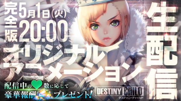 株式会社ステアーズ(本社:東京都新宿区、代表取締役社長 全 寅兌、以下ステアーズ)は、好評配信中のゲーム『デスティニーチャイルド』のオリジナルアニメーション完全版を、本日5月1日(火)20時より 生配信を行うことを決定いたしました。それにあわせまして、配信中のハート数に応じて豪華報酬がもらえるキャンペーンやサイン入り台本が当たるクイズキャンペーンを行いますことをお知らせいたします。