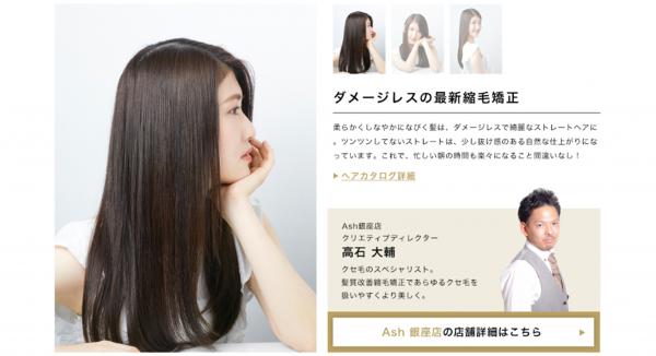 Ashの公式ホームページでは、縮毛矯正キャンペーンに合わせて特集ページを公開しています。うねりや広がりなど、くせ毛に関するお悩みを解消するための施術である縮毛矯正について「くせっ毛のスペシャリスト」銀座店 高石店長が、ダメージを抑えたナチュラルなストレートヘアをご提案します。モデルには、2018ミス・インターナショナル日本代表の杉本雛乃さんを起用し、ツヤのあるナチュラルなストレートスタイルを公開する他、縮毛矯正についてよくある質問をQ&A形式で紹介しています。