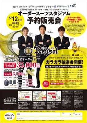 工場直販オーダースーツSADAは、5/12(土)に日立柏サッカー場 特設ブースにて、開門からハーフタイム終了迄の約3時間、2018年モデル柏レイソル公式オーダースーツのスタジアム販売会を開催致します。