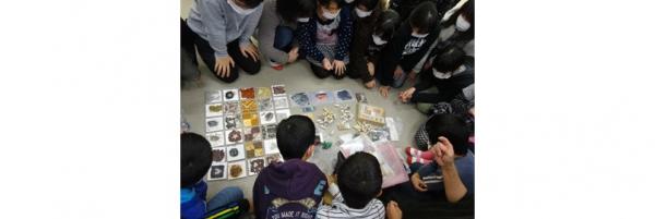 身近な石は、よく見ると色に溢れています。1 日目は、気に入った石を砕いて、絵の具の元となる粉(顔料)をつくり、自分だけの色をみつめます。2 日目は、自分でつくった色の粉を絵の具にして、表現活動を行います。日田市は大分県を代表する画家・宇治山哲平のふるさとです。出来上がった絵の具に、宇治山と同じように方解末を練りこんでみます。いつもの絵の具と、なんだか違うかな?最後には、宇治山の作品を鑑賞する時間も設け、ふるさとの偉人の特別な色彩と、自分たちの作った天然顔料の色彩を体感します。