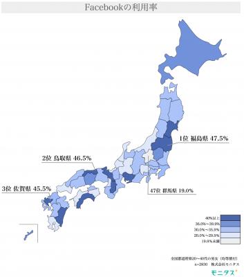 ● Facebookの全国利用率は33.6%。最も利用率が高い県は、福島県の47.5%。
