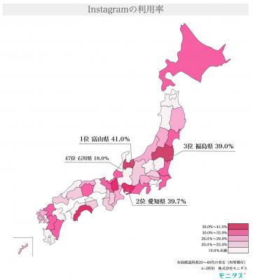 Instagramの利用率で、最も高い県は、富山県の41.0%。次いで愛知県 39.7%、福島県 39.0%、高知県 38.8%、滋賀県 38.7%、福岡県 35.4%という結果になりました。