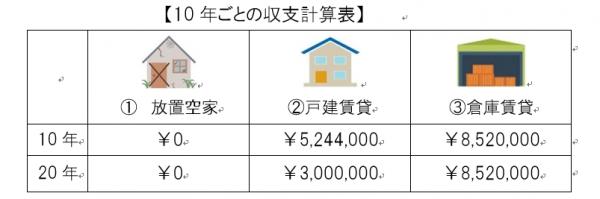 例として、東京都板橋区にある駅から徒歩20分、土地面積100m2の物件を想定し、(1)空き家を放置した場合、(2)新築に建て替え、戸建て賃貸物件とした場合、(3)倉庫として建て替え、賃貸倉庫物件とした場合の3つのケースで収支を比較したところ、結果は上記の表のようになりました。