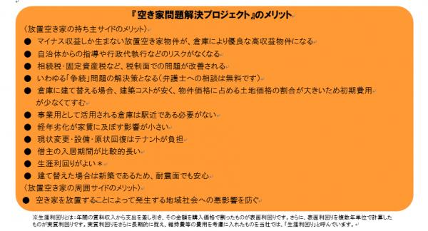『空き家問題解決プロジェクト』は、衛生、防災、防犯、景観などの面で社会的に問題となっている放置空き家物件を賃貸倉庫物件として再生することで、社会的な問題を根本的に解決する上、空き家のオーナーに新たな収益をもたらすプロジェクトです。深刻化する放置空き家問題の解決の一助となるべく、低予算で建て替えもしくはリノベーションします。