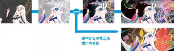 制作作業の手順やブラシの各種パラメーター設定をデスクトップ上で再現することが可能です。この機能により、作業を行った任意の箇所まで戻して描き足すことや設定変更をして異なるテイストの作品を創作することができます。