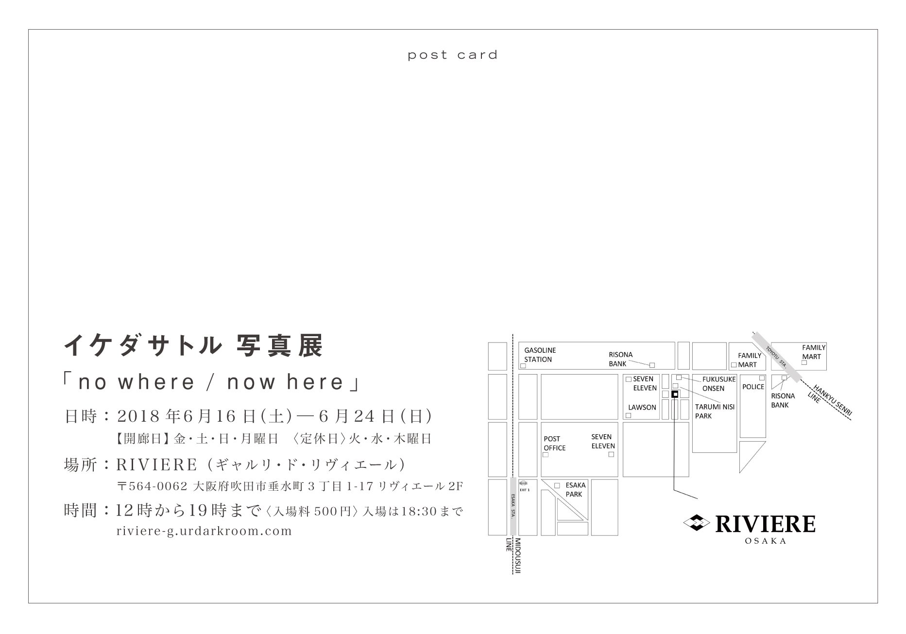 大阪・吹田のフィルム写真暗室ギャラリー リヴィエールは、愛知在住の写真家イケダサトル氏が新宿・Alt_Medium にて 2018 年 1 月に開催した個展「no where / now here」を、関西初の巡回個展として、2018 年 6 月 16 日(土)から2018 年 6 月 24 日(日)まで開催いたします。(発表日:2018 年 5 月 1 日)