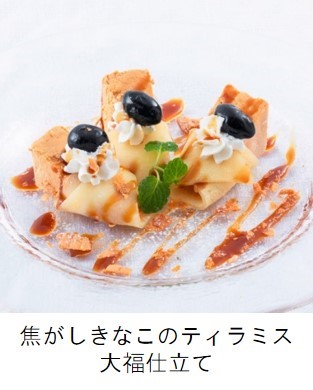 江戸末期、初代北川源左衛門が桂離宮横に店を構えてから15代続いた和菓子屋の歴史を受け継ぎながら誕生した和菓子屋「京都吉祥庵」(※)との初コラボスイーツです。焙煎したきな粉を使用したティラミスを八つ橋風の皮で包み、黒蜜ソースをかけました。その他、“スイーツは別腹女子”や“スイーツ男子”も納得の新メニューを取り揃えました。