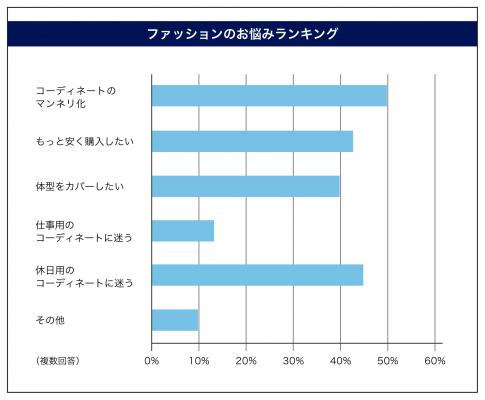 ファッションキュレーションサービス「PONTE」が40代女性を対象にファッションに関するお悩みアンケートを行なったところ、ファッションに関するお悩み1位は「コーディネートのマンネリ化」、2位は「もっと安く購入したい」という結果となりました。