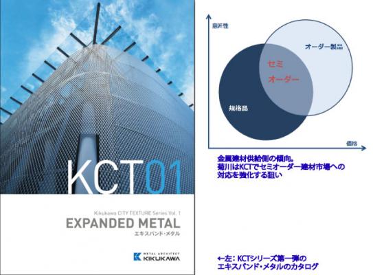 KCTシリーズ第一弾として刻み巾をひし形などに圧延したメッシュ状の金属建材である内外装用の「エキスパンド・メタル」の標準寸法と取付工法を定め、エキスパンドの網目と仕上を数パターン用意し、カタログに集約。これをグループ会社であるキクカワタクト株式会社が販売します。