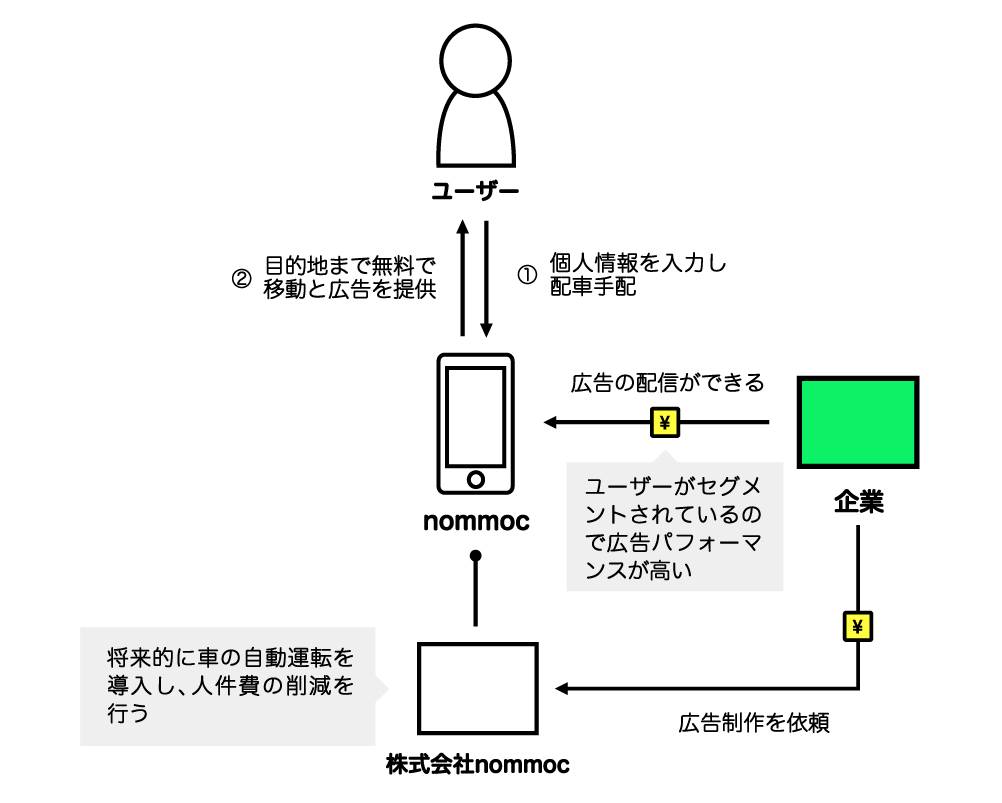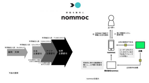 飛行機、電車、バス、タクシーなど私たちの移動には必ずコストが付くのが常識でした。コストを考えずに移動が無料になったら、人々はもっと多くの場所に行きたいと思うのではないか。また、将来的には「nommoc (ノモック) 」にAIを活用することで個人の嗜好性を元にその人にあった情報(広告)が移動中の車内で流れるようになることを考えています。これが実現すると移動時間中もその人の人生を豊かにするために必要な情報が収集できるという、移動中の時間的価値が飛躍するサービスになると思っております。