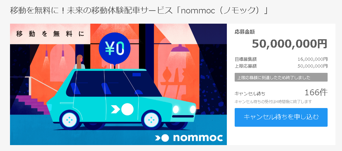 移動を無料にすることで未来の移動体験の実現を目指す株式会社nommoc (本社:福岡市 代表取締役社長:吉田拓巳)は5月12日、247名の投資家から5,000万円の資金調達を実施しました。資金調達の申し込みを開始した5月12日19時~から申し込みが殺到し、資金調達に要した時間は4分30秒と日本において過去最速のものとなりました。今回の資金調達によりサービス開発、設備への投資、人材獲得などを図り2019年3月のサービス開始に向けて用意して参ります。