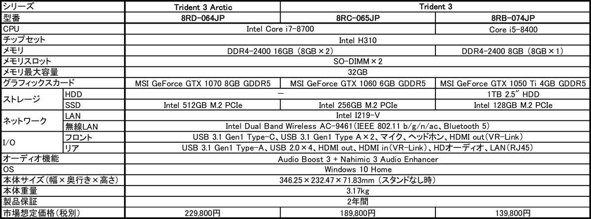 今回市場投入するのは、ホワイト筐体が特徴の最上位モデルとなる「Trident 3 Arctic 8RD-064JP」と、ブラック筐体の「Trident 3 8RC-065JP」、そしてエントリーモデルとなる「Trident 3 8RB-074JP」の3モデル。市場想定価格(税別)は、それぞれ229,800円、189,800円、139,800円です。