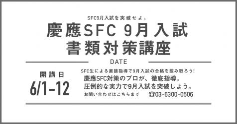 慶應SFCには『6月に出願し、9月に入学するAO入試』という特徴的なAO入試があります。このSFC9月入試が、既卒生や帰国生の方が今年最初に出願できるAO入試です。AO義塾代々木校では、6/1~6/12にかけて、SFC9月入試書類対策講座を開講します。この期間は提出書類ブラッシュアップの最後の期間になります。まだ書類が完成していない方、最後に書類の完成度を向上させたい方、このチャンスを最大限に活かして、納得の出願に向けてサポートいたします。SFCの9月入試対策をしているのはAO義塾だけ。AO義塾で対策をして、一緒に合格を掴みましょう!