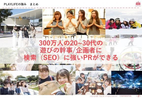 PLAYLIFEは現在、月間300万ユーザー、遊びのプラン数14.000件、スポット数22,000の登録数を誇る「“遊び”のリアル体験投稿メディア」となっています。ユーザーは10~30代のカップルや女子が中心で“遊びの意識”が高い幹事や企画者が利用。全てオリジナルで作成している記事のため、Googleからも評価される良質なコンテンツ提供をしています。その結果「ドライブ、日帰り、旅行、観光エリアד目的軸”(女子会、デートなど)」で各記事が上位表示されており、だからこそ10~30代の、ネット検索で遊びのコンテンツを探すことが多い「遊びの企画者」に対して強いPRができるのです。