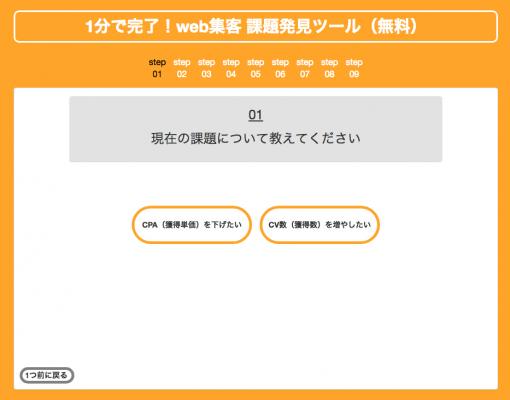 独自に収集した業界や商材に応じた適切なweb集客のパフォーマンス値を元に、現状と理想とのギャップを自動判断し、解決すべき課題と解決の方法について診断結果としてレポートします。マーケティング担当者は完全無料で、かつ登録なども不要で何度でも利用できます。