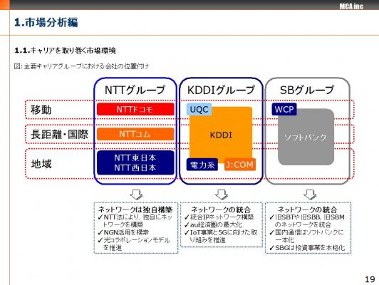 近年、主要キャリアグループ各社の決算をみると、純粋な通信事業の伸び以外に、その他の事業の拡大もあり、売上高は微増ながらも拡大基調にある。NTTやソフトバンクグループがそれぞれ9兆円、3兆円を超える規模に成長しており、KDDIグループは5兆円を突破した。2014年度時点において、国内通信市場はNTTグループが9兆円弱、KDDIグループは4.4兆円、ソフトバンクグループが3兆円弱の約17兆円であったが、2017年度は18兆円強に成長している。
