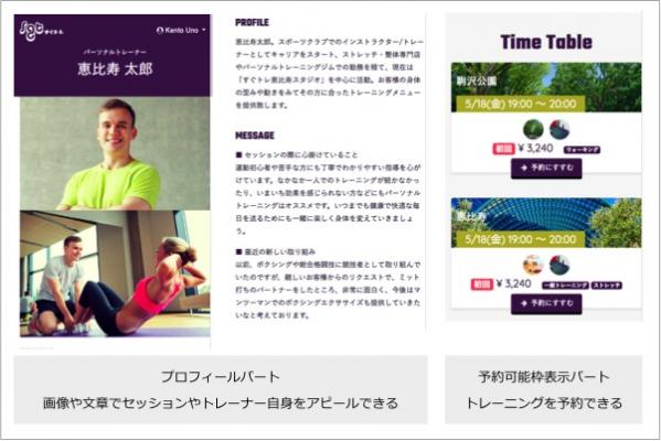 トレーナーページでは、トレーナーのプロフィール、提供可能なトレーニングメニュー、トレーナーの写真、トレーニングの予約が可能な場所と日時が表示され、ユーザーはそれらを閲覧・比較して、自分に見合ったトレーナーを探すことになります。