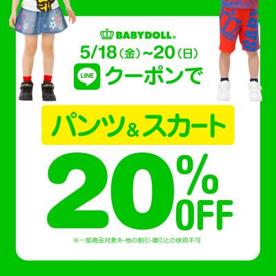 株式会社コージィコーポレーションが運営するベビー・キッズ服のBABYDOLL(ベビードール)がBABYDOLL(ベビードール)・STARVATIONS(スターベイションズ)各店、通販各店にて、5月18日(金)~20日(日)の3日間限定< LINEクーポン★パンツ・スカート★20%OFF >を開催します。
