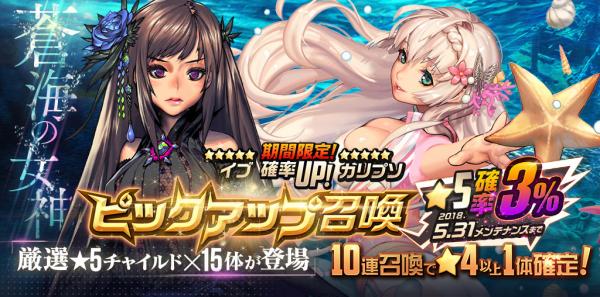 荒れ狂う大波!新スキル効果「津波」を持つ新追加チャイルド★5「カリプソ」(CV:佐倉綾音)と、全てを押しつぶす波濤!★5「イブ」(CV:石川由依)がピックアップ召喚15体の中でもさらに召喚確率UPで登場!!