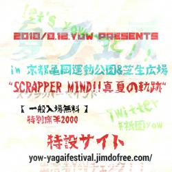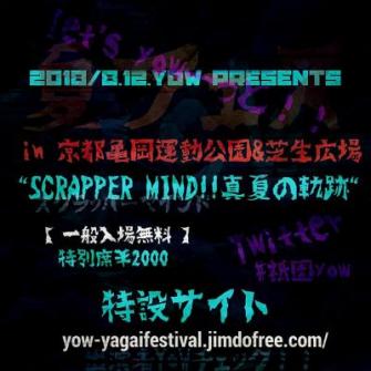 2018年8月12日(日)に祇園YOW主催の野外音楽フェスティバル「スクラッパーマインド!!真夏の軌跡」を京都府亀岡市にある亀岡運動公園野外ステージ&芝生広場にて開催致します。