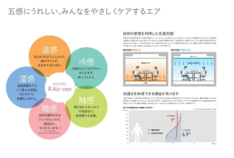 テスト販売時は、専門的な知識がある会社に販売促進を行っていた関係上、技術的な説明をする資料は準備していましたが、一般向けにはコンセプトを説明した簡易的なパンフレットしかありませんでした。この度作成したパンフレットは「R Air-con」導入のメリット・快適さの理由・従来の輻射空調(冷温水式)との違いなどを、イラストや図・表を用いて分かりやすく説明しています。